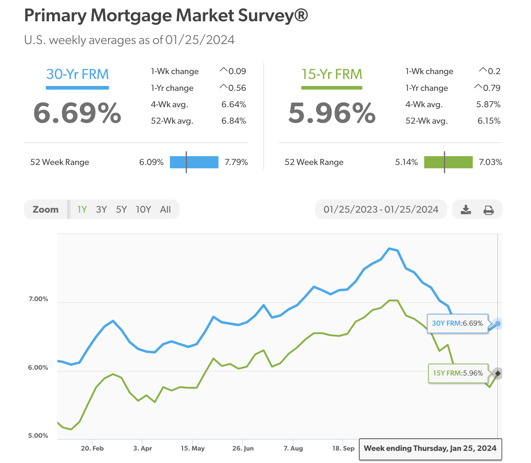 30-year fixed-rate mortgage rates averaged 6.69% as of January 25, while 15-year fixed-rate mortgage rates averaged 5.96%.
