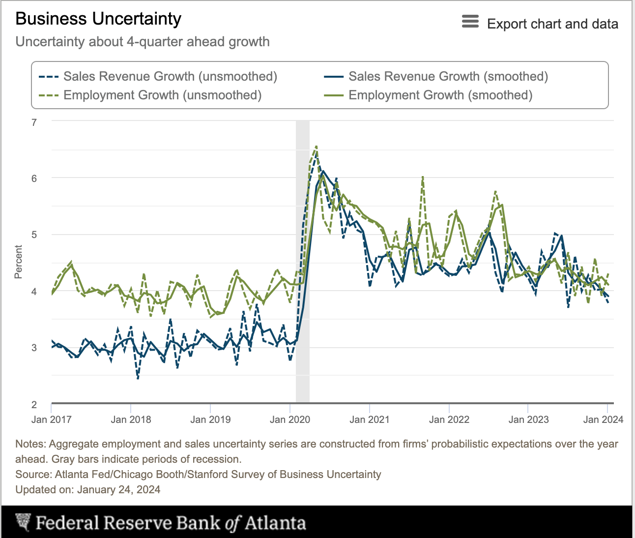 According to the Federal Reserve Bank of Atlanta, sales and employment growth expectations continue to decline: