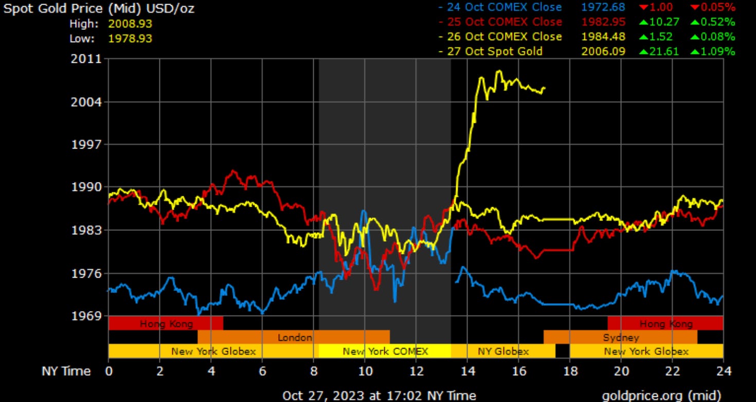 As the conflict in the Middle East appears to be gaining momentum, the price of gold rose higher, reaching $2,006 per ounce:
