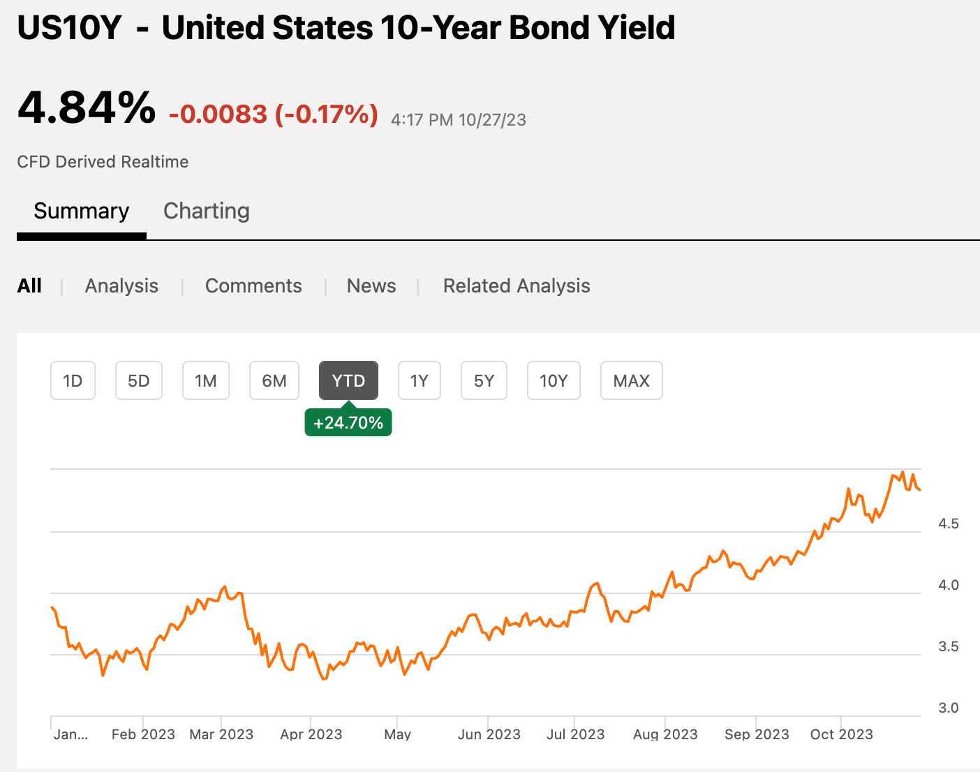 10 Year U.S. Treasury yields are rising at the fastest pace since the 1980s. Year to date, the yield increased nearly 25%: