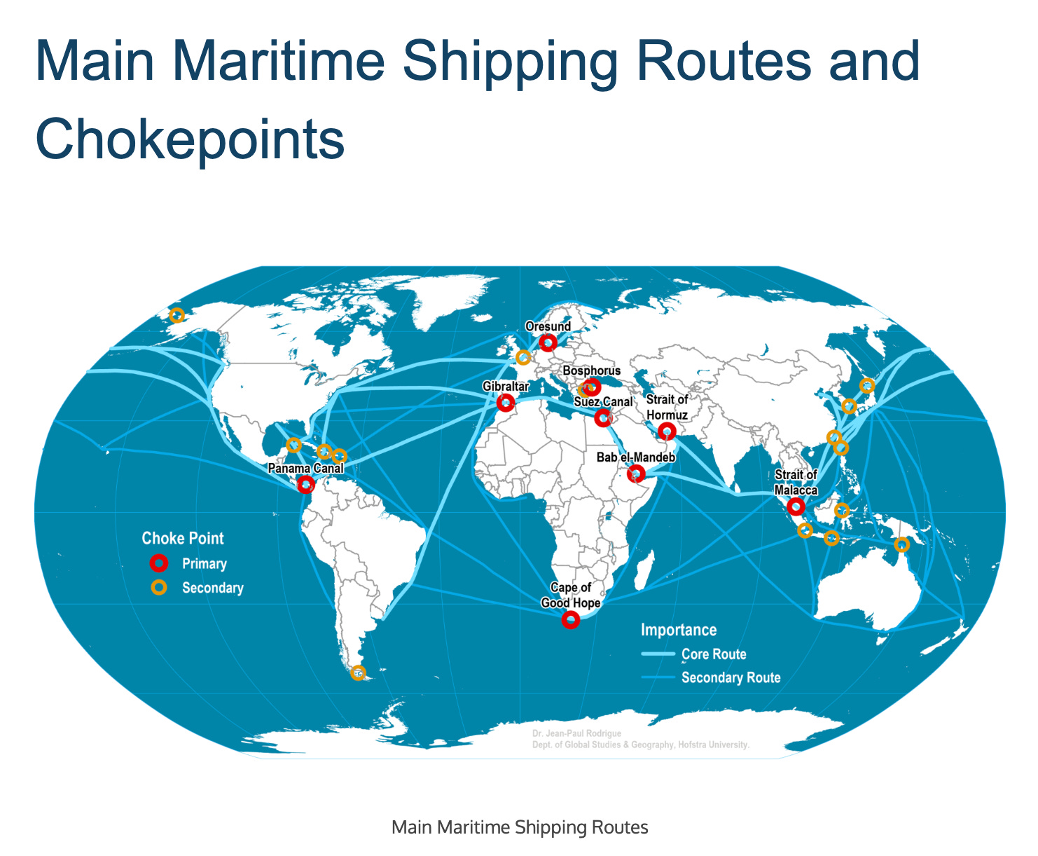 What are the major shipping routes to be aware of and where are they located? How does an increase in transportation risk affect us? I cover more details on the exposure of global economy to trillions in losses in the recent video:
