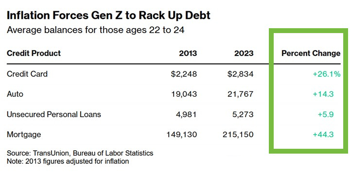 Generation Z have more debt than ever: they now hold 44% more mortgage debt, 26% more credit card debt and 14% more in auto loan than their age group (ie Millennials) in 2013.
