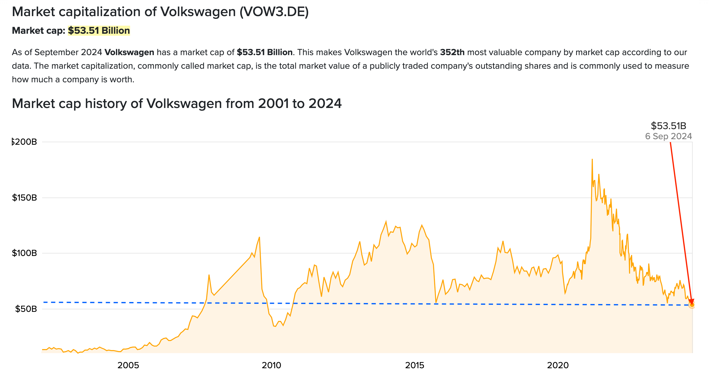 Volkswagen, the biggest employer in Germany with more than 300,000 employees, for the first time in 87 years is shutting down two of its plants. Over the past five years, the company lost nearly a third of its value. Additionally, it is now the worst-performing European car maker: