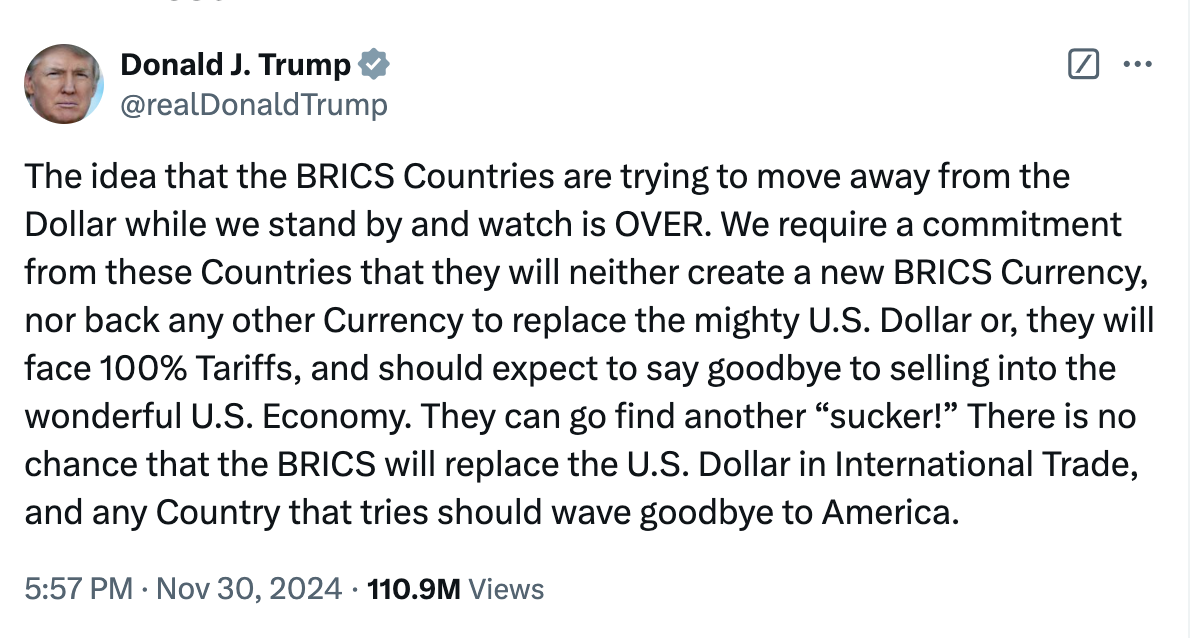 In late November, Donald Trump threatened to impose 100 percent tariffs on the BRICS+ bloc if it dares to continue its efforts to support currency multipolarity. In reality, however, such rhetoric only proves that the BRICS+ is, indeed, moving in the right direction as it seeks to create a more just financial and economic system.