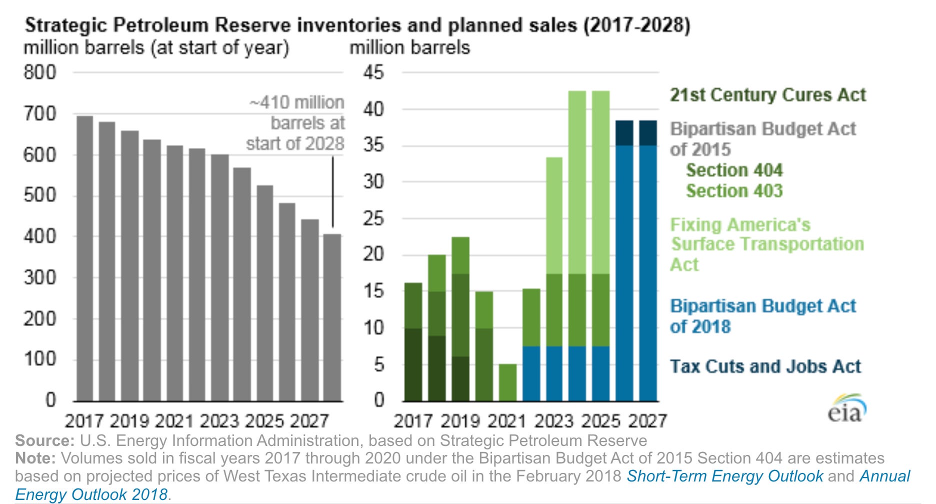 Three bills enacted in 2015 and 2016 called for the sale of million of barrels in 2017 through 2025. Revenues from these sales go directly to the U.S. Department of Treasury. These bills are: The Bipartisan Budget Act (Section 404), enacted in 2015; The 21st Century Cures Act; and The Fixing America’s Surface Transportation Act, enacted in December 2015.