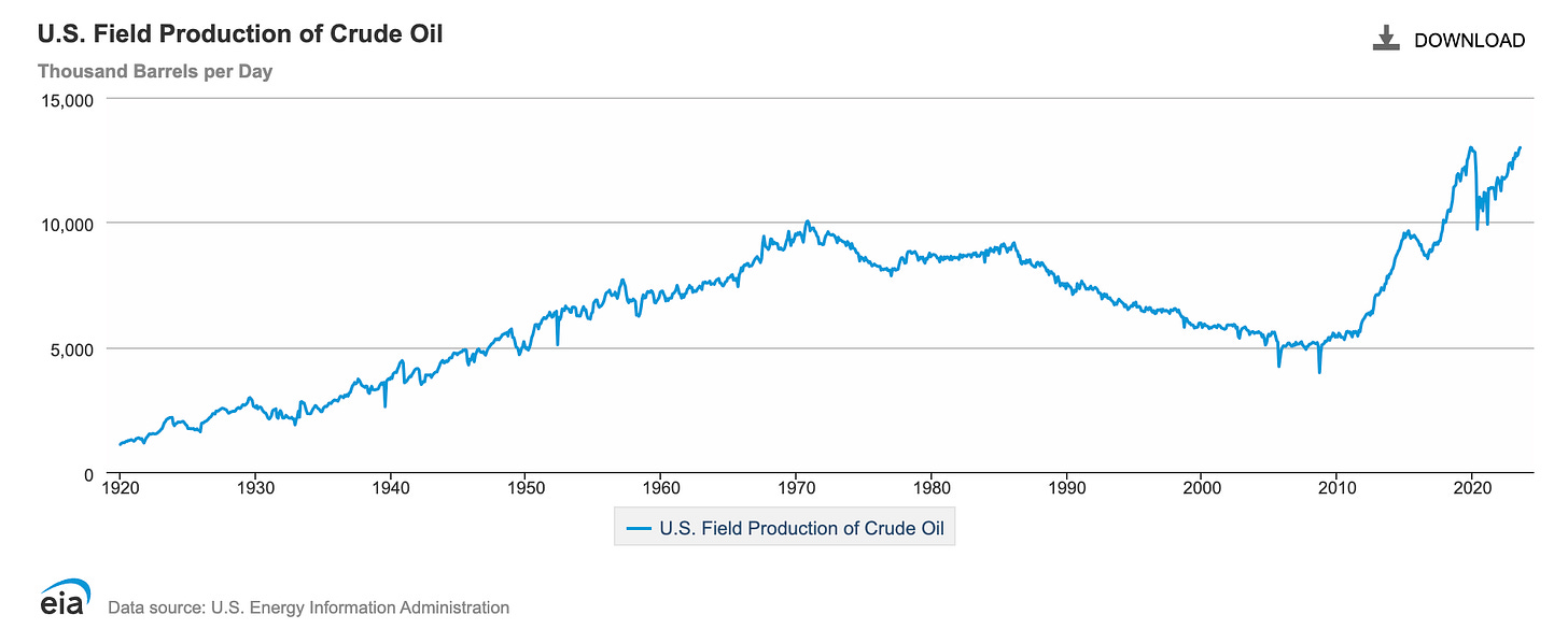 US oil production increased to pre-pandemic levels of 13.2 million barrels per day (vs. 12 million barrels per day):