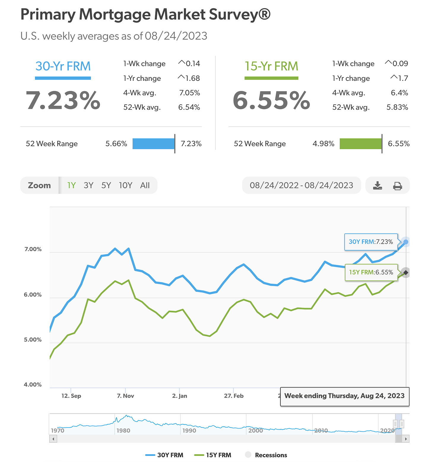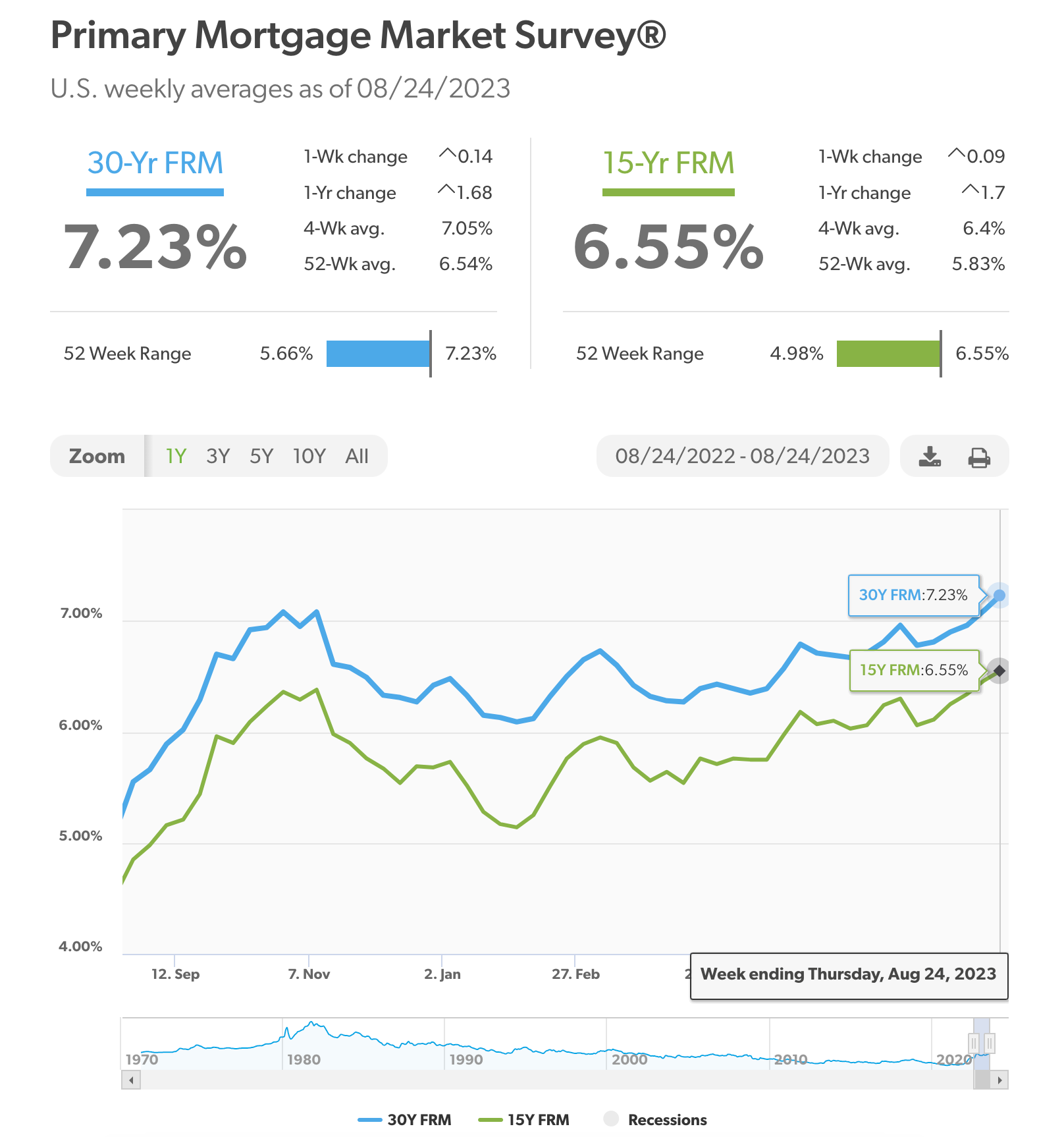 U. S. mortgage rates jumped to 7.23%, the highest level since May 2001. Rates are expected to continue rising due to two main factors: inflation and government deficit spending: