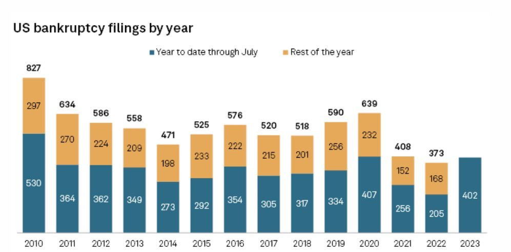 Bankruptcies January through July 2023 are above 2022 levels; and are on track to pass 2021 levels.