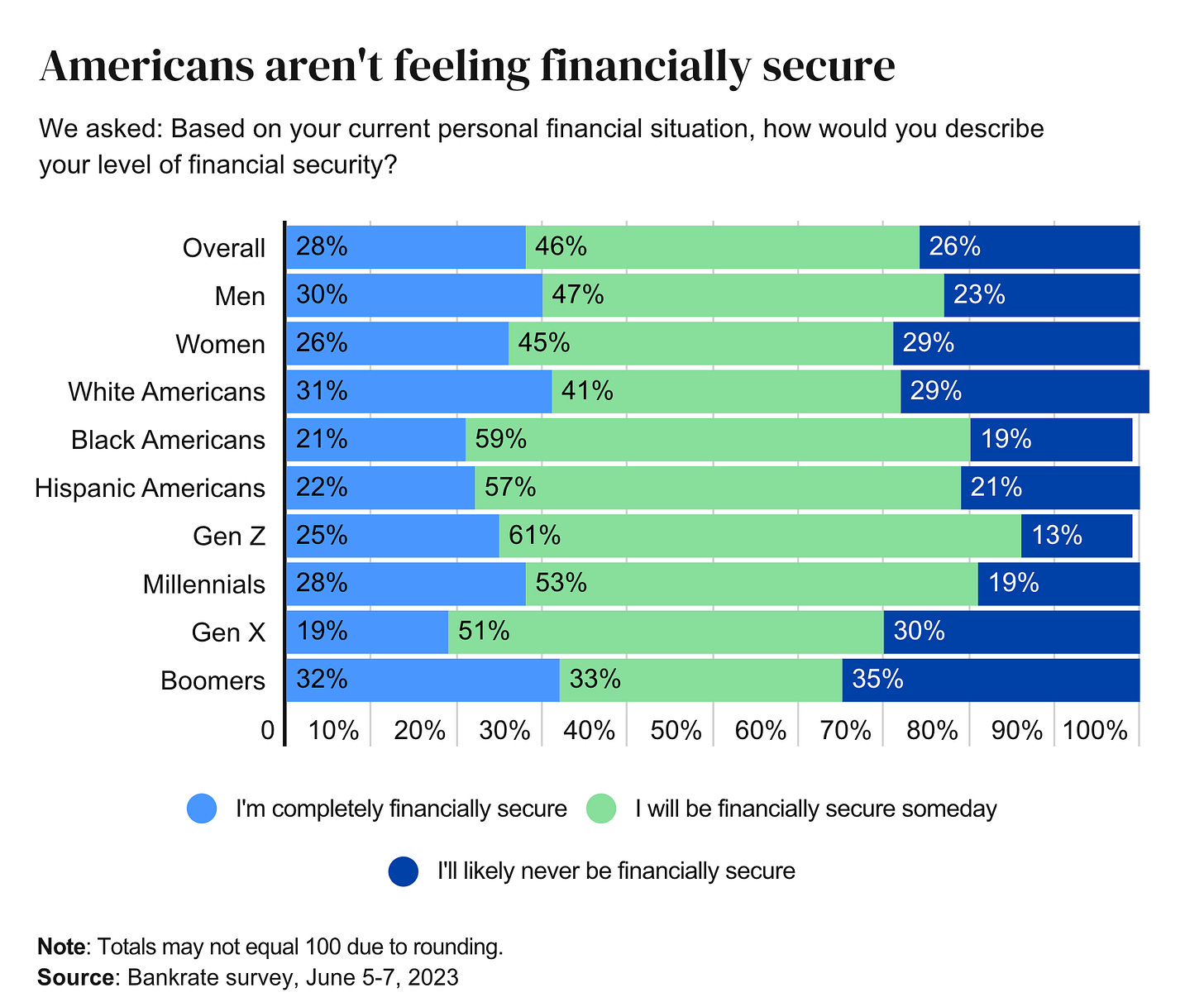 According to the Bankrate survey, 72% of Americans do not feel financially sound. Their primary concerns are inflation, primarily concerned with food costs as well as growing economic uncertainty. A quarter of the surveyed Americans feel that they will never be financially secure. A Bankrate survey published a month earlier, in May, found that financial insecurity is the number one reason why 52% of Americans claim to have mental health issues.