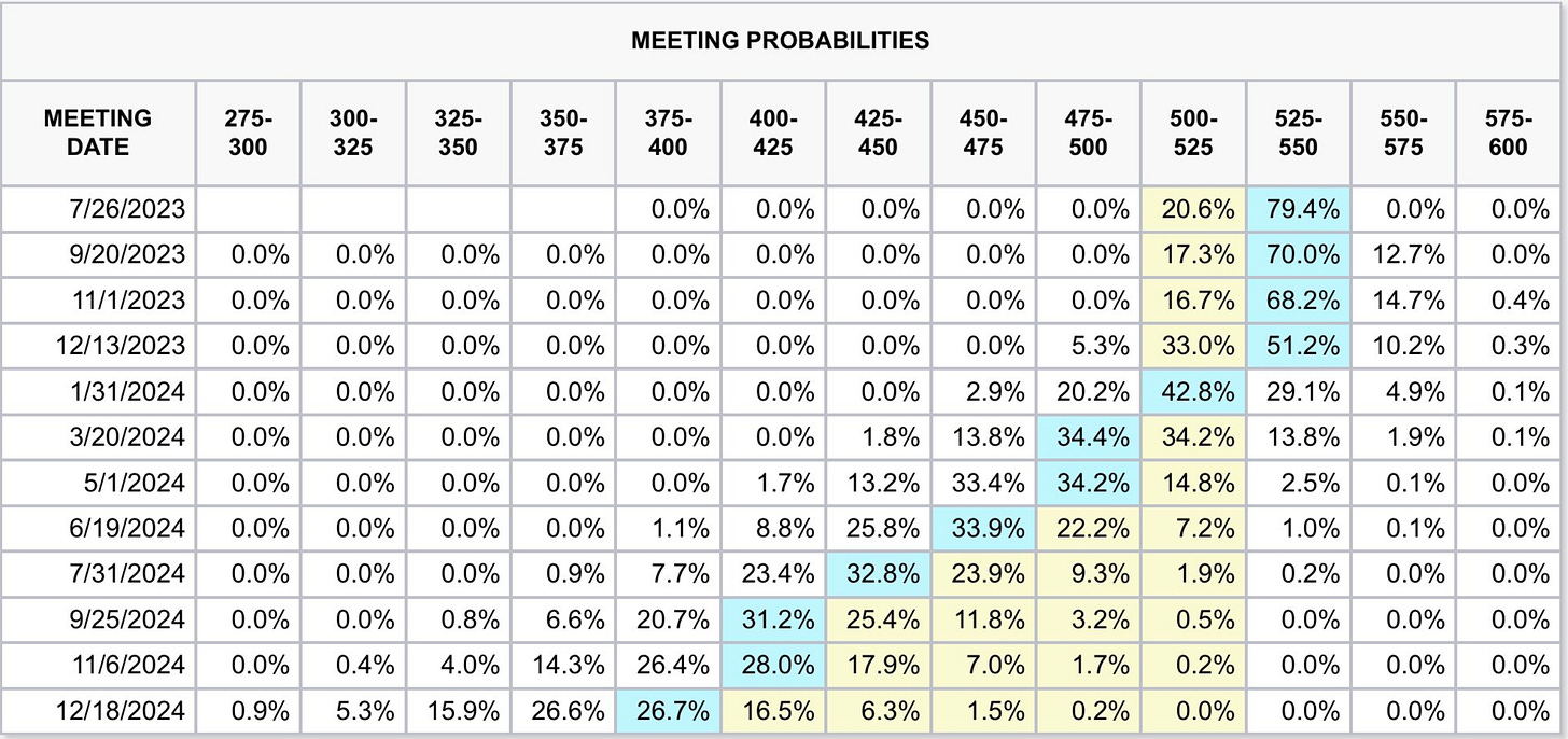 With regards to the projected two interest rate increases later this year, Fed Chair Powell says it’s “hard to know what rate level will achieve the Fed’s goals.” With so much uncertainty, it’s safe to assume that the Federal Reserve would rather do short term damage than risk inflation spiking. Odds of a 25 basis point rate hike in July just are 80%. There’s a 15% chance of 2 more rate hikes by September 2023: