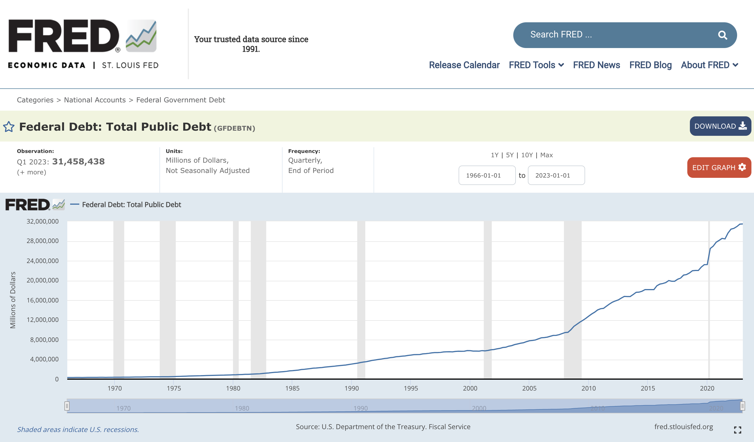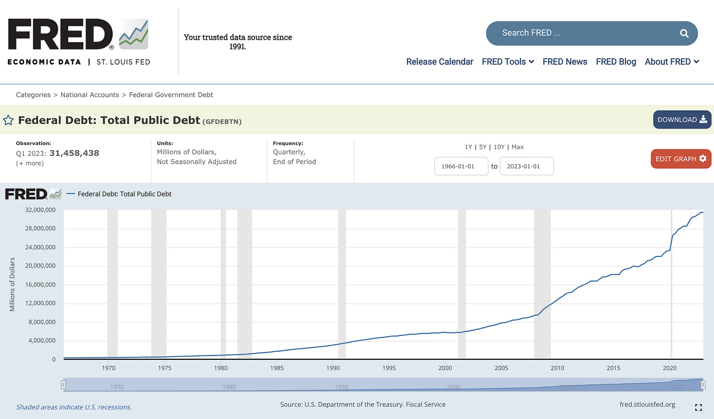 The total debt and obligations is around 250 trillion Dollars , 23 trillion Dollars just in the dept of defense black budget and 2.3 trillion dollars missing , 9/11 pentagon missile strike .there is no intention of ever paying any fake money back .especially as of yesterday June 23 2023 ,there is a coup