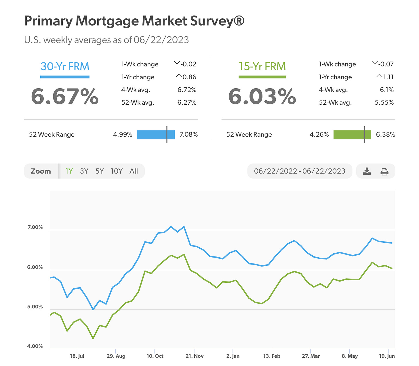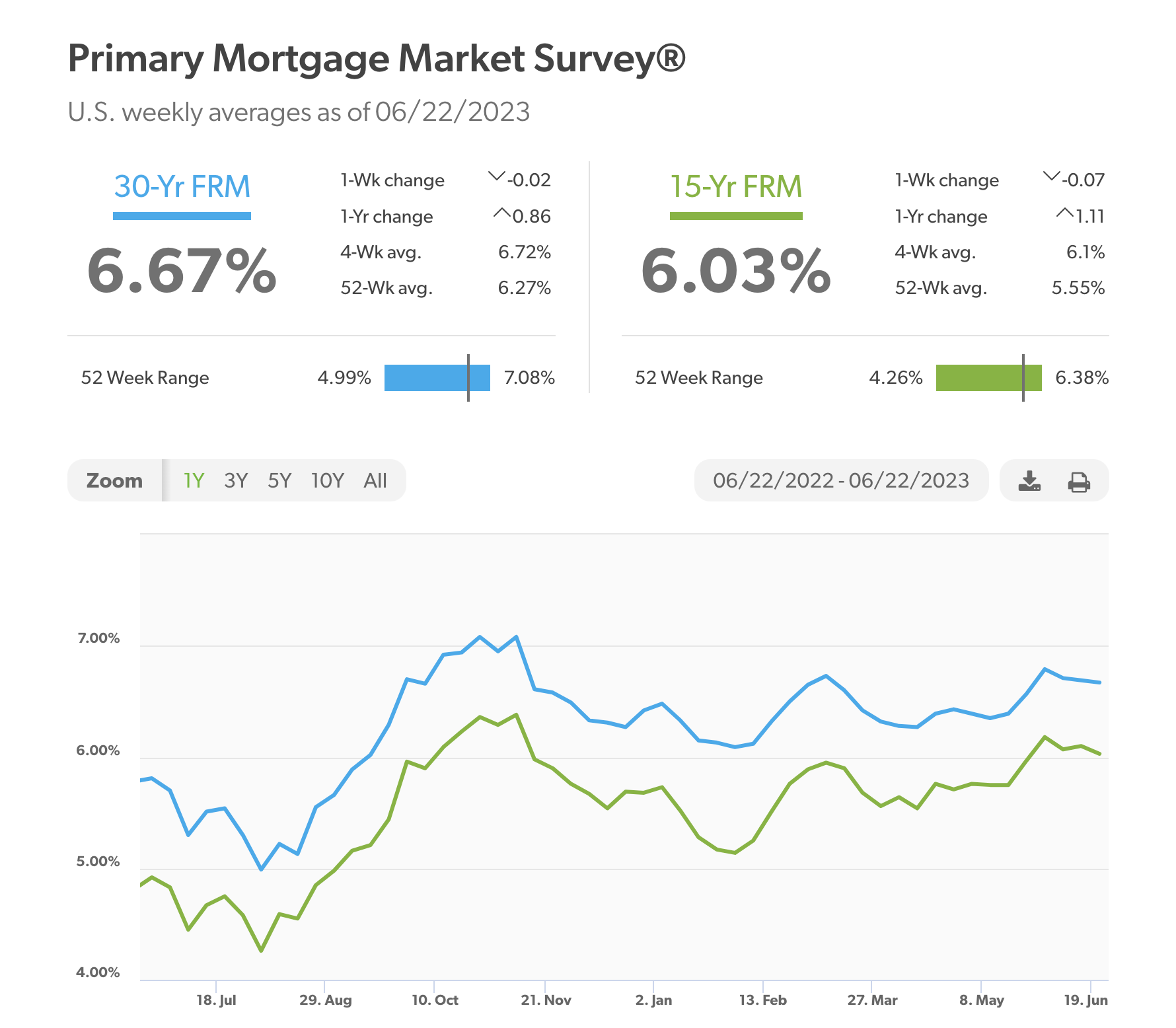 According to Freddie Mac, long term mortgage rates continued to fall this week. 30-year fixed-rate mortgages averaged 6.67% as of June 22, down from last week when they averaged 6.69%: