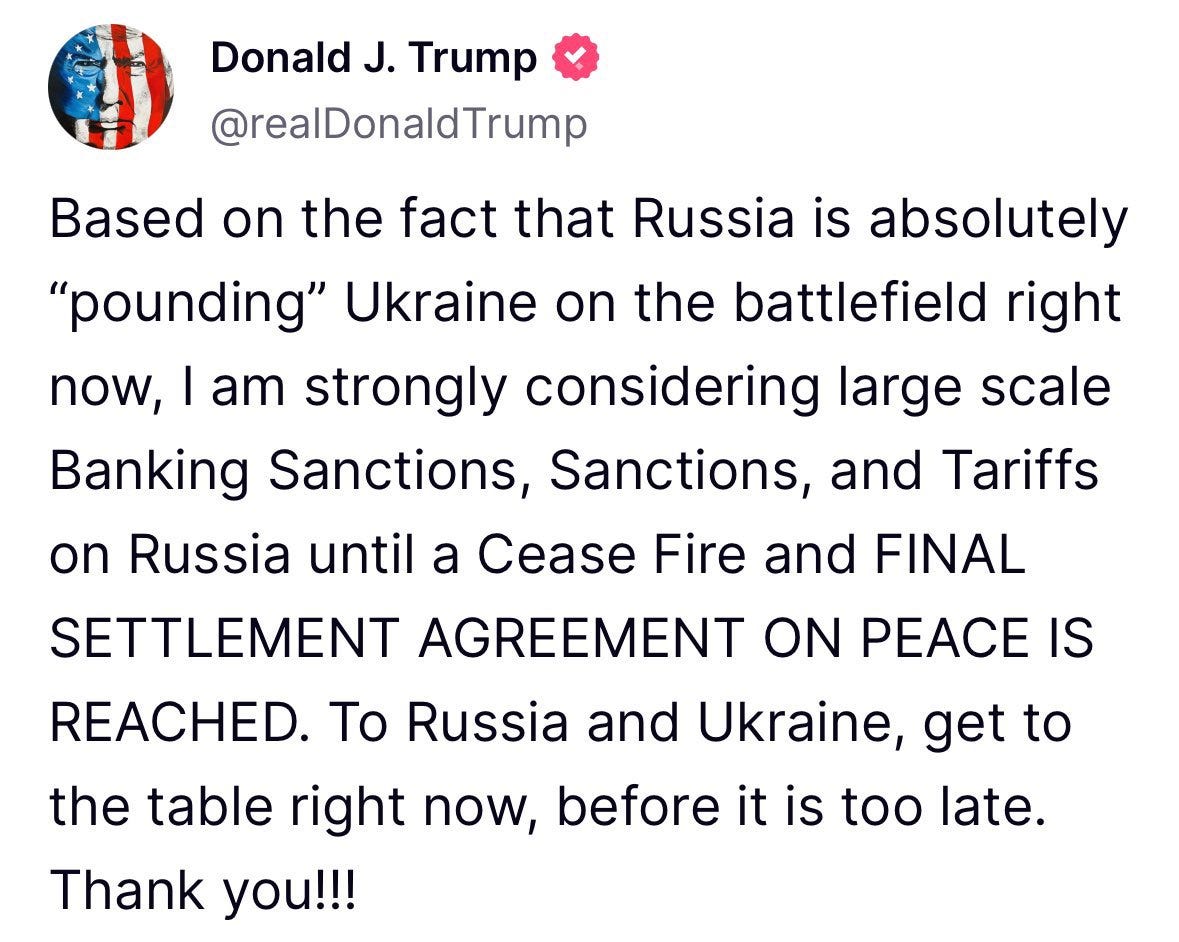 Trump says he’s now considering new sanctions on Russia because it is “pounding Ukraine on the battlefield.”