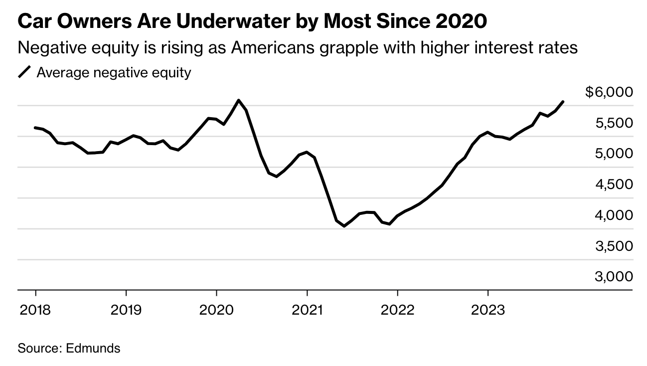A record number of American consumers are struggling with vehicle loans. According to Edmunds, in November, borrowers with negative equity were underwater by an average of $6,054, the most since April 2020 and well above pre-pandemic averages. Additionally, repossessions have increased, with car owners being delinquent on loan payments at highest rate in three decades.