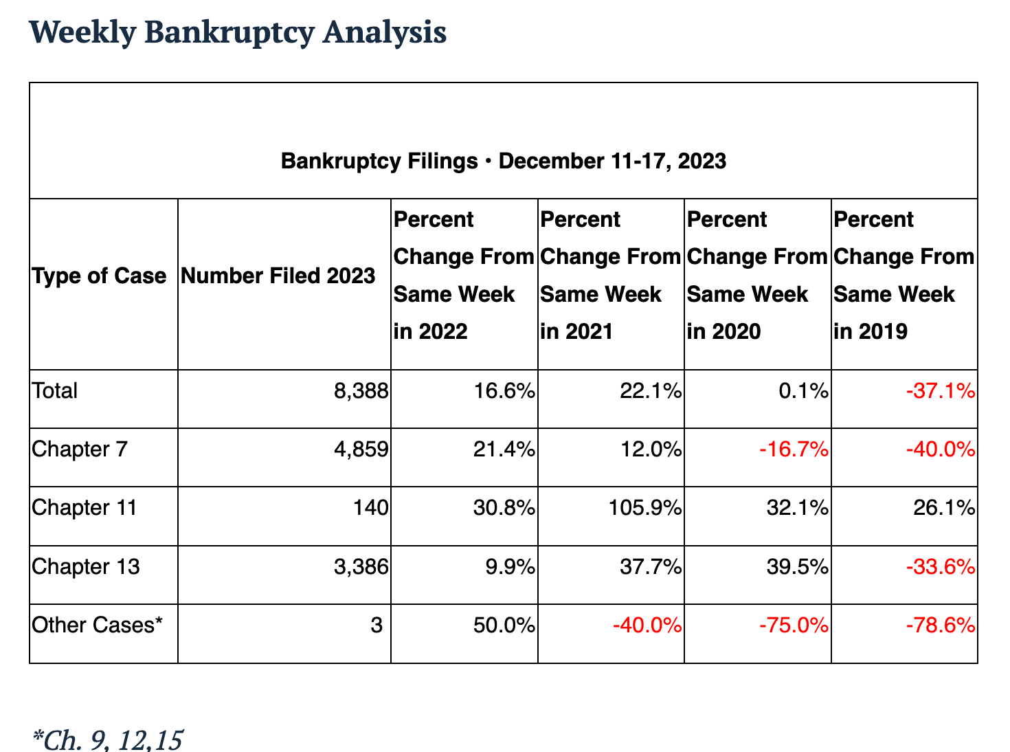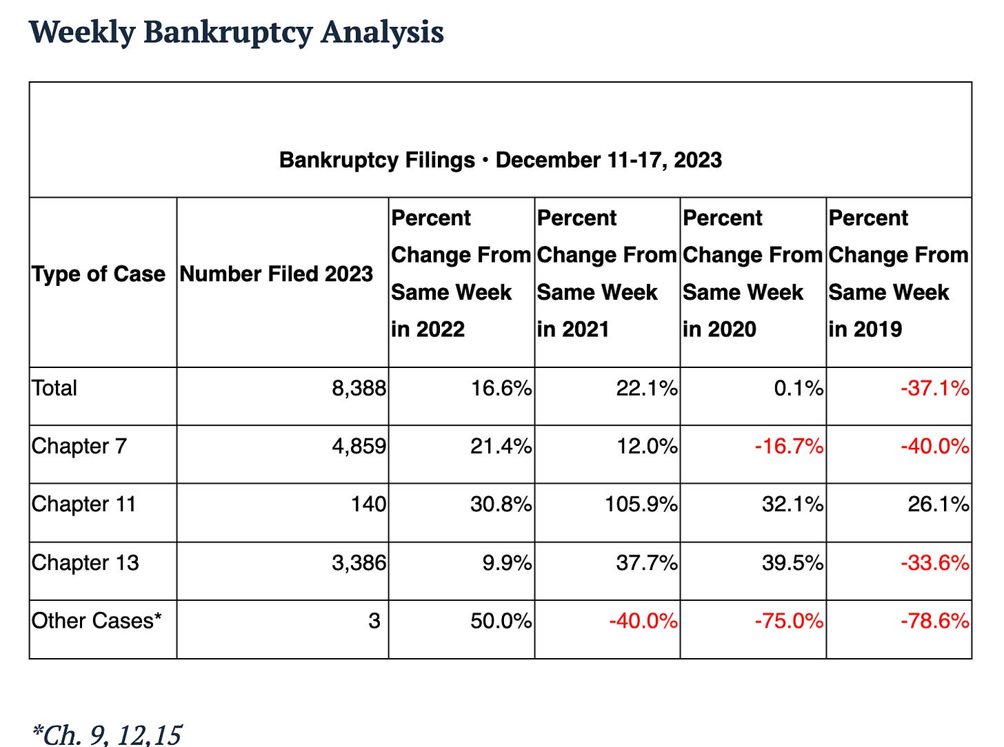 Even though December data is available through the second week of the month, it is not promising. Bankruptcy filings show considerable increases across categories.