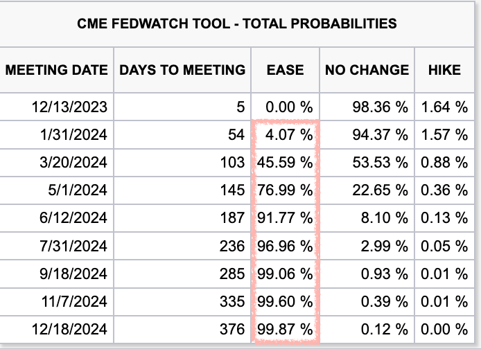 There is an unlikely 4.07% chance of a rate cut in January 2024, a 45.59% in March 2024 and an above 77% chance of rate cuts starting in May 2024.