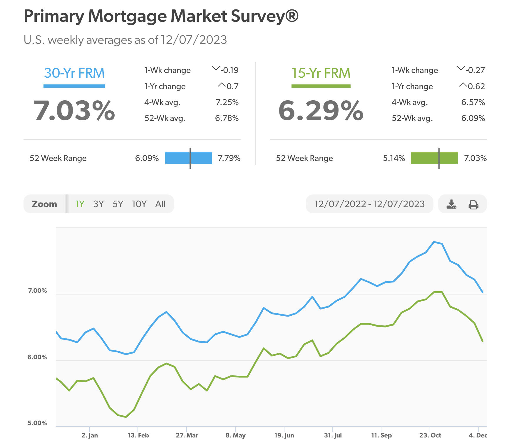 According to Freddie Mac, 30-year fixed-rate mortgages averaged 7.03%, while 15-year fixed-rate mortgages averaged 6.29%.