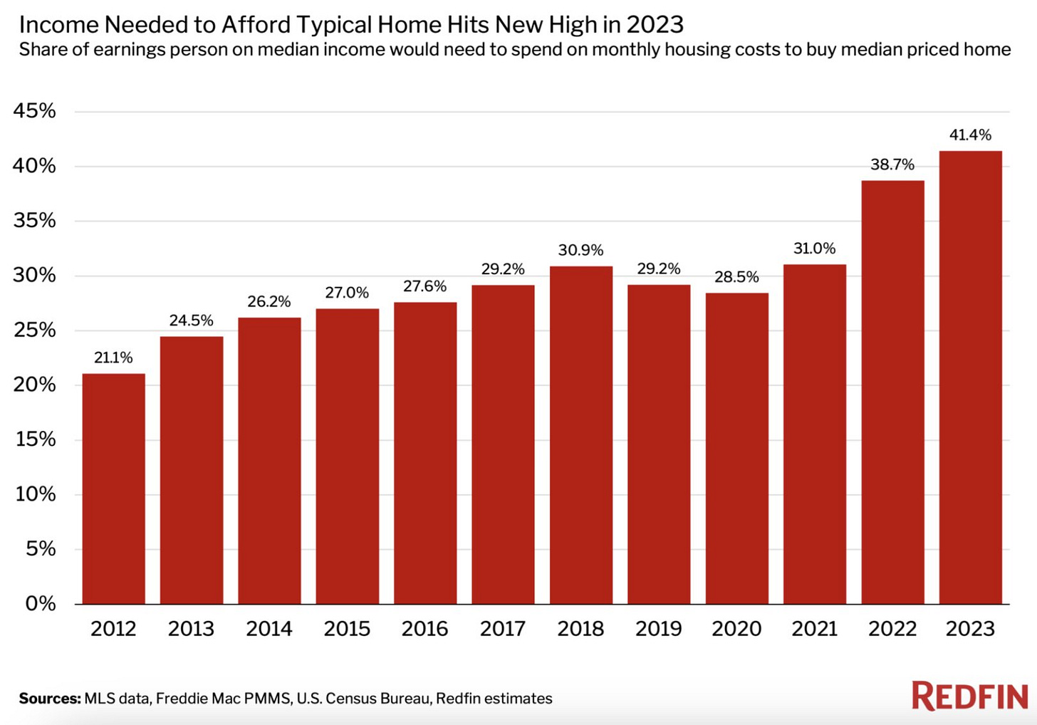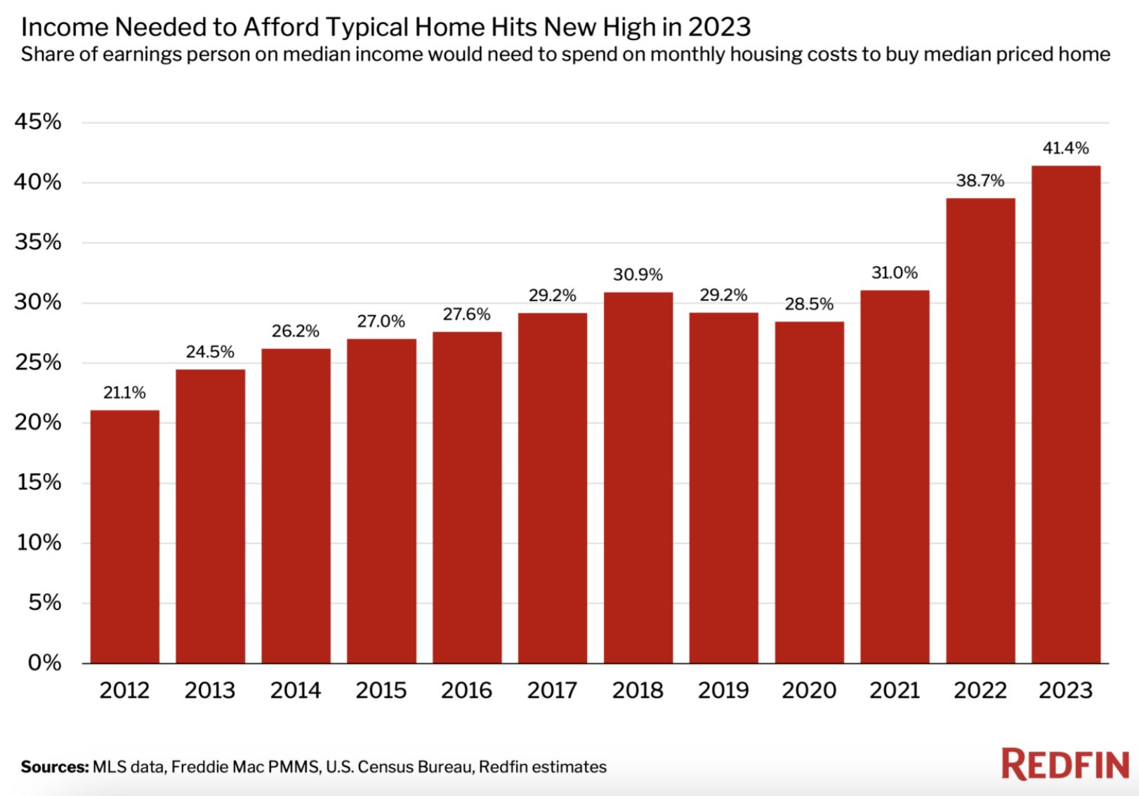 Per Redfin data, the income needed to purchase a home in the U.S. hit a record 41.4%, a dramatic increase from 28.5% in 2020.