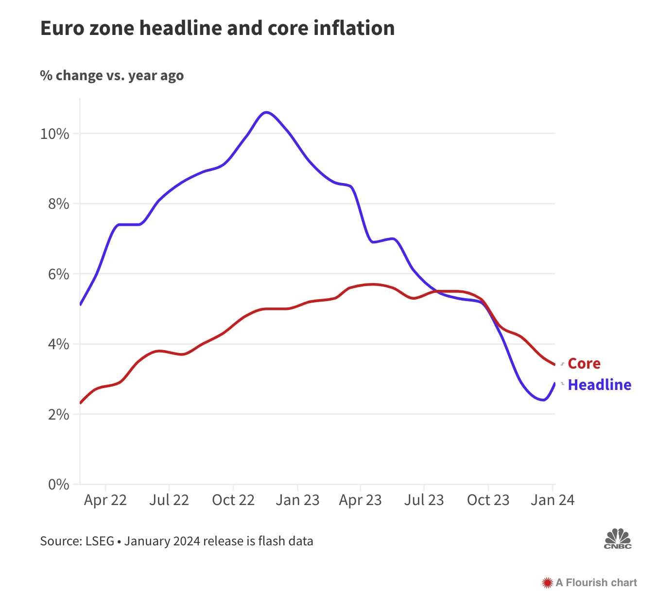 The EU is seeing inflation spike again despite its central bank aiming to start cutting interest rates. Inflation in the euro zone climbed to 2.9% in December, an increase from 2.4% in November.